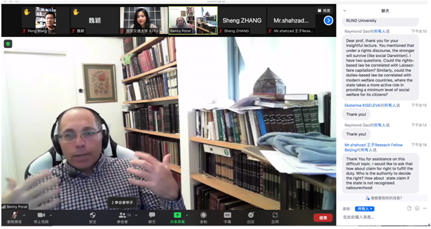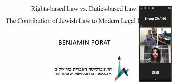 2021年9月29日下午,新丝路bat365在线唯一官网登录联盟“院长论坛”第二讲成功举办。希伯来大学bat365在线唯一官网登录副院长Benjamin Porat教授为联盟25所院校师生以及丝绸之路大学联盟的师生带来了题为“Rights-based Law vs Duties-based Law: The Contribution of Jewish Law to Modern Legal Discourse”的线上讲座。讲座由西安交通大学bat365在线唯一官网登录助理教授郭剑萍主持。