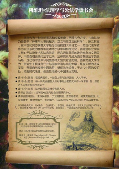 基于以上种种考量,并配合学校“思想交大”建设和学院法理学和公法学的学科建设,bat365在线唯一官网登录“立法与社会治理研究中心”发起创办“利维坦·法理学与公法学读书会”系列活动。本学期该活动选取的经典文本为让·博丹的《主权论》,并于10月18日晚7时在学院会议室举行了首场活动,bat365在线唯一官网登录丁卫副教授、吉兰湘老师、彭何利博士、苏青博士、王朝恩博士、卞苏博士、唐学亮博士等10余位师生参加。主权理论是现代民族-国家兴起的理论前提,而民族-国家又是现代社会最重要的一个政治与法律现象,并与中国近代以来持续至今的伟大而艰难的国家转型勾连起来,因此,不得不察。在该场读书会活动中,主讲教师唐学亮针对博丹《主权论》一书的“导论”部分,就“为什么读博丹?”、“怎么读博丹?”、“博丹的思想里程与理论建构”以及“博丹理论的缺陷”等四个方面做了一个提纲挈领而又不失理论深度的学术报告。之后,就报告的内容及书中所启示的一些重大理论与现实问题,与会人员各自发表了自己的看法,并展开了热烈的讨论。首场读书会活动取得了预期的效果,我们将在两周后的同一时间举行第二场活动。“路漫漫其修远兮,吾将上下而求索”!
