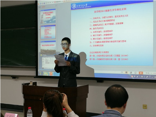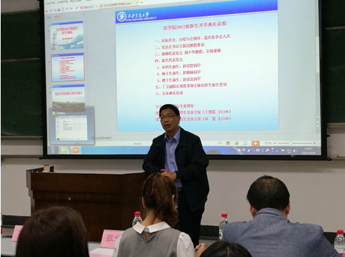 金秋送爽,丹桂飘香。9月9日下午,bat365在线唯一官网登录2017级新生开学典礼在主C105隆重召开。bat365在线唯一官网登录党总支书记王保民、文治书院院主任张爱萍、bat365在线唯一官网登录副院长丁卫、院长助理吉兰湘、法复合61班班主任王玉苹、法71班班主任李琳以及bat365在线唯一官网登录2017级全体本科生、硕士生、博士生新生参加了开学典礼。开学典礼由学生工作专职委员张乃钟老师主持。