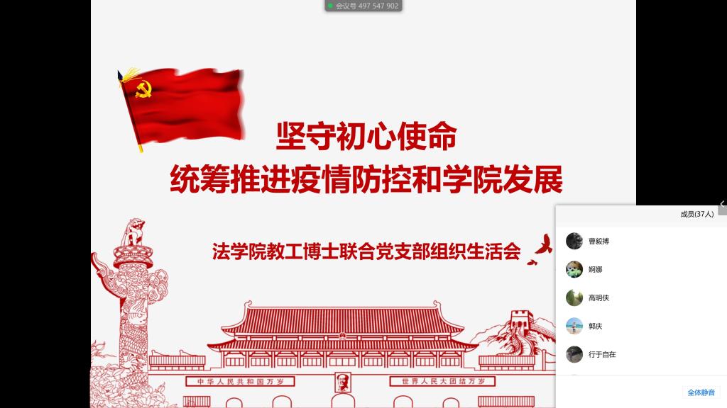 学生工作专职委员张乃钟通报了学院研究生工作。在学院疫情防控工作领导小组的领导下,bat365在线唯一官网登录各研究生党支部充分发挥战斗堡垒作用,每日帮助落实学生健康日报。学院密切关注学生思想和身体状况,重点关注假期留校以及湖北籍的同学,切实抓好研究生涉外疫情防控工作。疫情防控期间,学院研究生在做好自身防护的同时,积极参与社区的疫情防控工作,服务家乡;bat365在线唯一官网登录研究生会主动联合武汉大学bat365在线唯一官网登录研究生会举办工作经验分享交流活动,积极开展线上“春之声”法律文化节,丰富同学课余生活。张乃钟老师表示,接下来要加强与研究生导师的交流,进一步做好学生就业精准指导工作。同时,按照学校要求,做好学生分批返校准备工作,构筑平安校园。