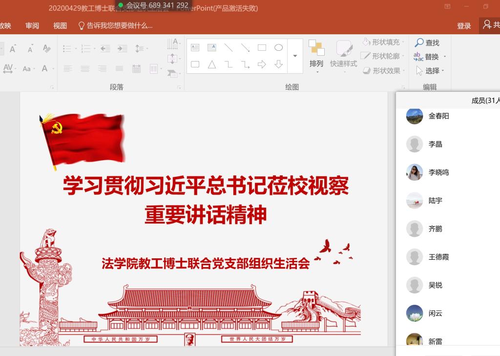 4月29日下午,bat365在线唯一官网登录教工博士联合党支部开展线上组织生活会,深入学习贯彻习近平总书记莅校视察重要讲话精神。党支部成员通过网络平台积极参加学习,本次活动由支部书记曹毅博主持。