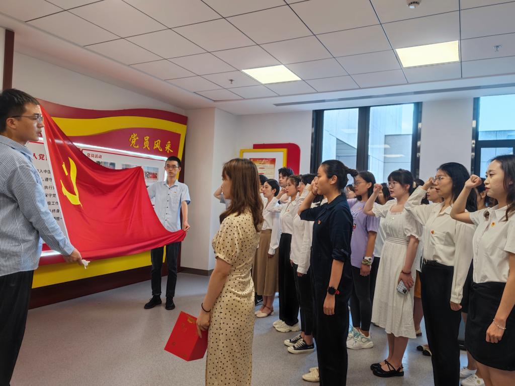 最后,在党总支秘书李晶老师的带领下,本次新入党的21名党员面向党旗庄严宣誓。各支部书记为新入党的同学佩戴党徽、赠送政治生日贺卡,祝贺他们在中国共产党成立100周年这一充满纪念意义的时刻成为中国共产党党员,并与新党员相互勉励要牢记初心使命,以高度的信念感和责任感投入到本职工作中,为党和人民的事业不懈奋斗!