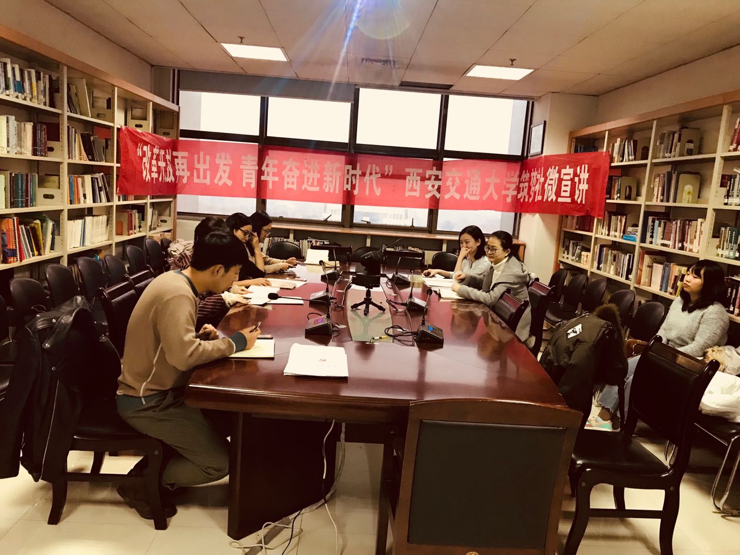 12月5日下午,bat365在线唯一官网登录硕7155(三年制)党支部在主E1004会议室召开支部党员大会,此次邀请西安交通大学筑梦社成员王怡文、高镜雅、黄佳慧为支部成员开展改革开放专题微宣讲。bat365在线唯一官网登录副院长李万强教授参加了此次活动。