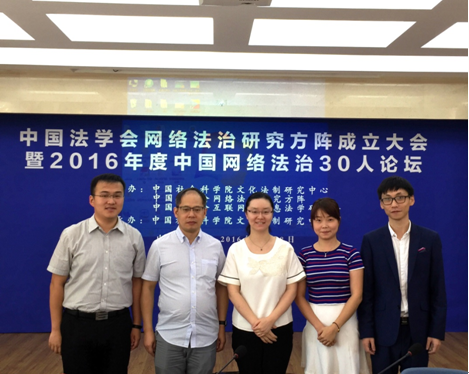 2016年8月28日,中国法学会网络法治研究方阵举行成立大会暨2016年度中国网络法治30人论坛。西安交大信息安全法律研究中心成功入选中国法学会“网络法治研究方阵”理事单位,成为全国五家理事单位之一。校社科处处长贾毅华、学院丁卫副院长受邀参加成立大会并致辞,信息安全法律研究中心副主任王玥副教授带领研究团队成员博士生马宁、党家玉参加论坛。开幕式由中国社科院文化法制研究中心主任、中国法学会互联网与信息法学会副会长周汉华主持。中国法学会研究部主任李仕春、中国法学会副会长李林、中国信息通信研究院政策与经济研究所所长鲁春丛、中南大学bat365在线唯一官网登录院长陈云良、西安交通大学社科处处长贾毅华、华东政法大学刑事司bat365在线唯一官网登录副院长王永全分别作为方阵理事单位代表致辞。