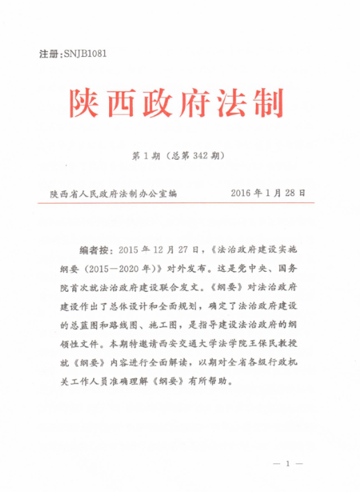 2015年12月27日,《法治政府建设实施纲要(2015-2020年)》对外发布。陕西省人民政府法制办公室邀请了西安交通大学bat365在线唯一官网登录王保民教授就《纲要》内容进行了全面解读,解读内容被采纳报省领导,送省属各机关,省法院、检察院,各市、县(区)人民政府,发各级政府法治工作机构,以期对全省各级行政机关工作人员准确理解《纲要》有所帮助。