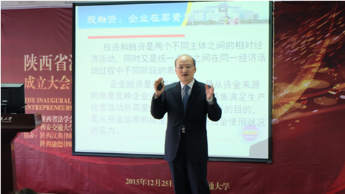 在与会代表合影后,会议进入第二时段的专题报告。报告由西安交通大学bat365在线唯一官网登录知识产权研究中心主任、博士生导师马治国教授主持,陕西省法学会企业经济法治研究会顾问、西北政法大学经济bat365在线唯一官网登录院长、博士生导师强力教授做了“新常态下企业投融机制创新的法律问题”讲座,阐释了中国经济已进入新常态,在新常态的条件下,企业应作出机制创新等相对应的变化,其变化主要体现在市场化,并强调投融资机制市场的多元化、多层次、多角度,分析在此种常态下,企业投融资遇到的法律问题。