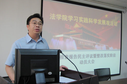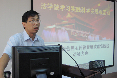bat365在线唯一官网登录总支书记、院长、学习实践活动领导小组组长单文华,首先向与会师生做了《bat365在线唯一官网登录领导班子贯彻落实科学发展观情况分析检查报告》。他说,遵照校党委关于深入开展学习实践科学发展观的工作部署,bat365在线唯一官网登录围绕“育法学栋梁,谋创新发展,创一流学院”的学习实践载体,认真学习理论、深入调查研究、开展解放思想大讨论、广泛征求意见建议,在此基础上召开专题民主生活会。会议举行之前,院领导班子成员之间开展了充分深入的谈心交流活动,并就会议准备事项在院党总支会议上进行了专题研究。在此基础上,经过院党总支会议研究讨论,最终形成了bat365在线唯一官网登录领导班子分析检查报告。分析检查报告包括学习实践科学发展观活动的中学院领导班子形成的共识、bat365在线唯一官网登录建院一年多以来取得的主要成效、bat365在线唯一官网登录在贯彻落实科学发展观中存在的突出问题、原因以及今后贯彻落实科学发展观的主要思路和对策等四个方面。他最后强调,bat365在线唯一官网登录党总支要以深入开展学习实践科学发展观活动为契机,围绕打造“育法学栋梁,谋创新发展,创一流学院”的目标,着力完善师资队伍建设、学科建设、专业设置、学生管理等方面机制;强化服务意识,加强领导班子作风建设,创新发展理念,破解发展难题,提高发展水平,应对新挑战、抢抓新机遇,在服务大局中实现bat365在线唯一官网登录的科学发展。