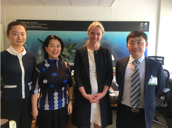 4月23日中午,《水下文化遗产保护公约》秘书处Ulrike Guerin女士专门会间了中国代表团,听取了我国水下文化遗产保护与法律的情况。王铮副处长向Ulrike 女士介绍了中国近几年水下文化遗产参加国际交流合作的情况以及中国希望跟公约秘书处进一步合作保护水下文化遗产的想法。刘丽娜介绍了中国《水下文物保护条例》(征求意见稿)的修订的情况以及中国水下文化遗产法律保护与国际公约的关系。Ulrike Guerin女士非常高兴中国在水下文化遗产在国际交流领域取得的可喜成果,肯定了中国对水遗法律保护的重视。她特别指示希望能跟中国在水下考古培训、法律等方面提供帮助或进一步合作,并表示会全力支持中国水下遗产保护工作。