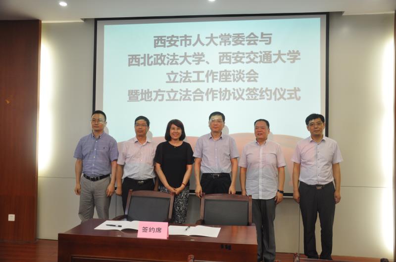 为深入贯彻落实党的十九大精神,推进科学立法、民主立法、依法立法,进一步提高立法质量,发挥高校专业优势,实现地方立法实践工作和法学教育研究的深度融合、相互促进、共同提升,助推法治西安建设,西安市人大常委会与西北政法大学、西安交通大学立法工作座谈会暨地方立法合作协议签约仪式”于6月20日上午在西北政法大学雁塔校区研究生综合举行。西安市市委组织部常务副部长、人大常委会副主任薛振虎,市人大法制委主任委员、常委会法工委主任牛犁和市人大常委会法工委其他领导,西北政法大学校长杨宗科,西安交通大学人文社科处处长贾毅华,西安交通大学立法与党内法规研究中心主任王保民和部分师生代表、西北政法大学立法研究所所长朱继萍和部分师生代表等参加了会议。