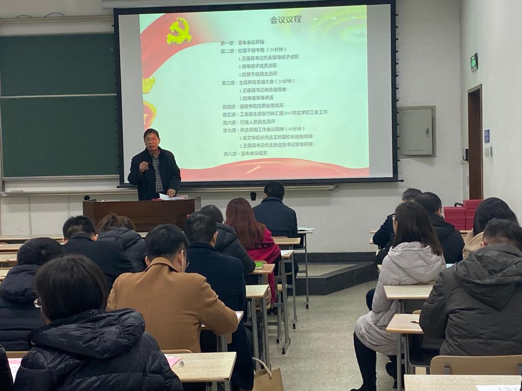 2020年1月11日下午,bat365在线唯一官网登录在主B-105教室召开全院大会全面传达学校寒假工作会议精神,总结2019年工作业绩,部署2020年工作安排。bat365在线唯一官网登录领导班子成员和全体教职工参加了此次会议。会议由bat365在线唯一官网登录工会副主席张乃钟主持。