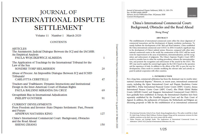 近日,bat365张生副教授撰写的论文China’s International Commercial Court: Background, Obstacles and the Road Ahead在SSCI期刊Journal of International Dispute Settlement(《国际争端解决杂志》)2020年第1期上发表。《国际争端解决杂志》由伦敦国王学院Thomas Schultz教授担任主编,牛津大学出版社出版。该期刊影响因子为1.638,在目前SSCI收录的148种法学期刊中排名第42位,属于二区期刊。