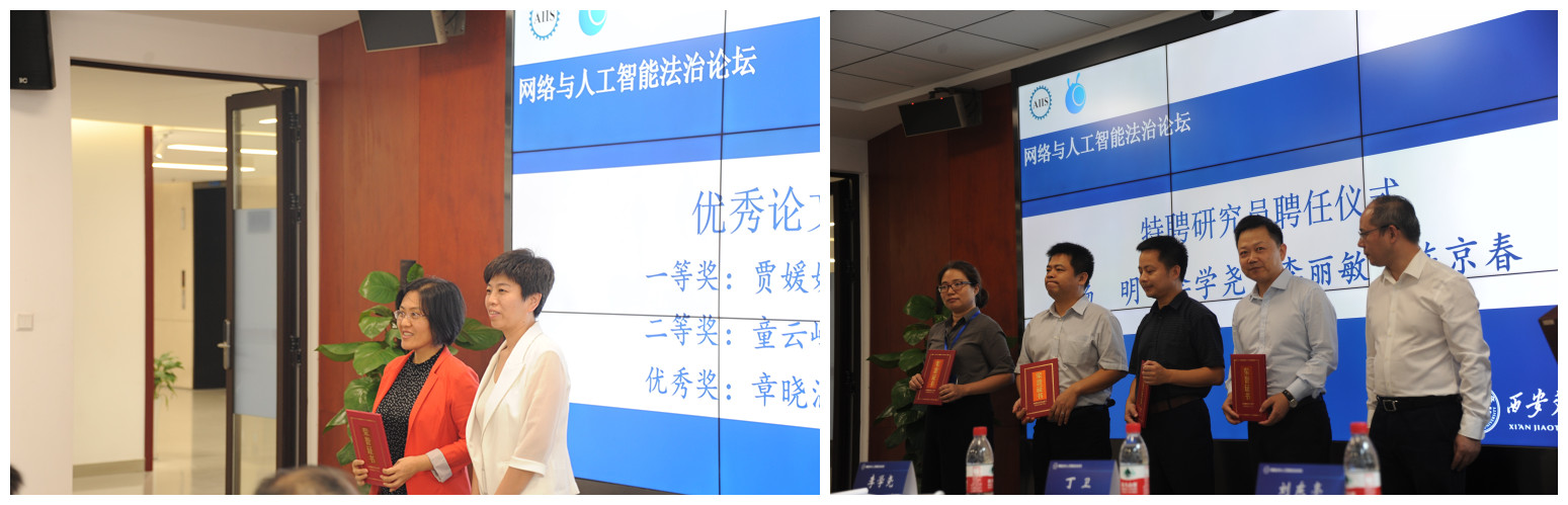 在此次论坛上,西安交通大学人工智能与信息安全法律研究中心聘请杨明教授、李学尧教授、李丽敏教授、陈京春教授为特聘研究员并为其颁发了聘书。西安交通大学学报(社会科学版)张丛副主编为评选出的优秀论文作者代表进行了颁奖。