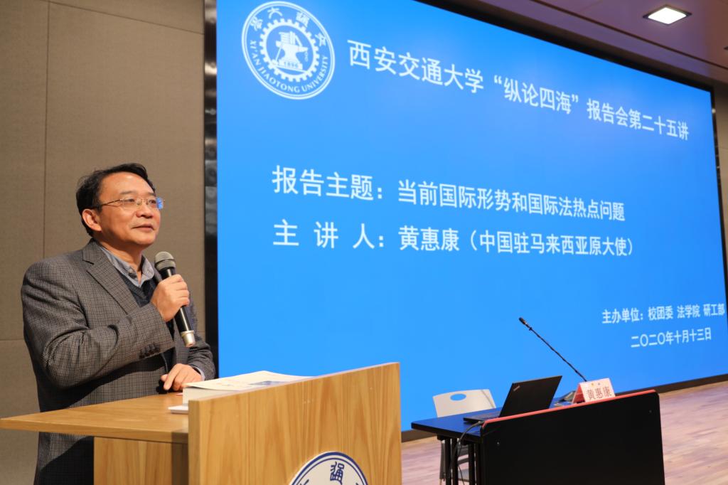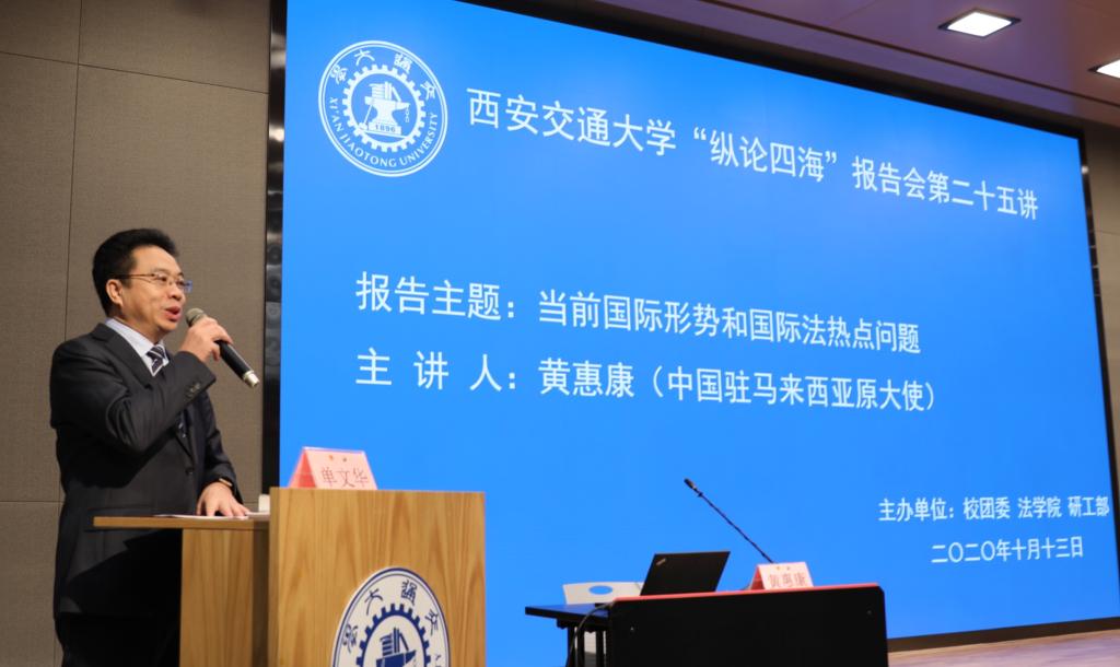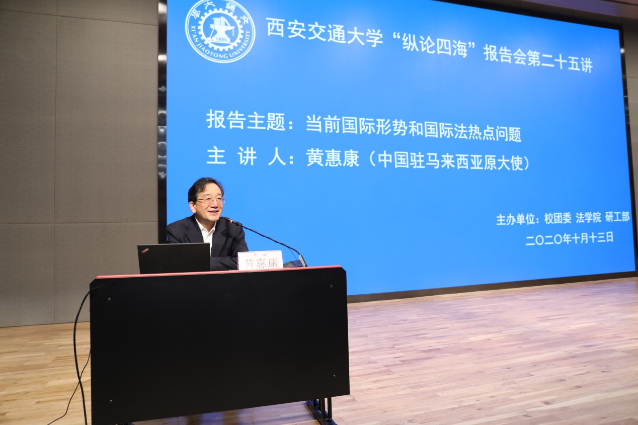 此报告会由西安交通大学党委宣传部、校团委、bat365在线唯一官网登录和研工部共同主办。“纵论四海”报告会系列是学校为开拓广大学生的国际视野、丰富前沿知识、促进学生全面发展而组织的高水平讲座,曾获得共青团中央“五个一工程”优秀文化活动奖,至今已经举办了24次,先后邀请中国前任驻美国大使李道豫、驻英国大使马振岗、驻日本大使徐敦信、驻德国大使梅兆荣、驻俄罗斯大使李凤林等名家大师来校与学生近距离交流,产生了突出的学术和社会影响。本场报告会还吸引了校外法律界同仁的高度关注与积极参与。
