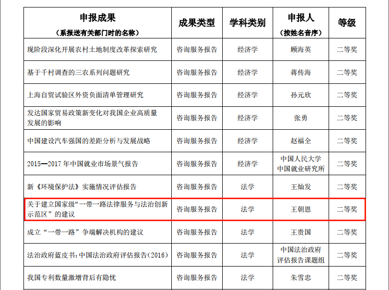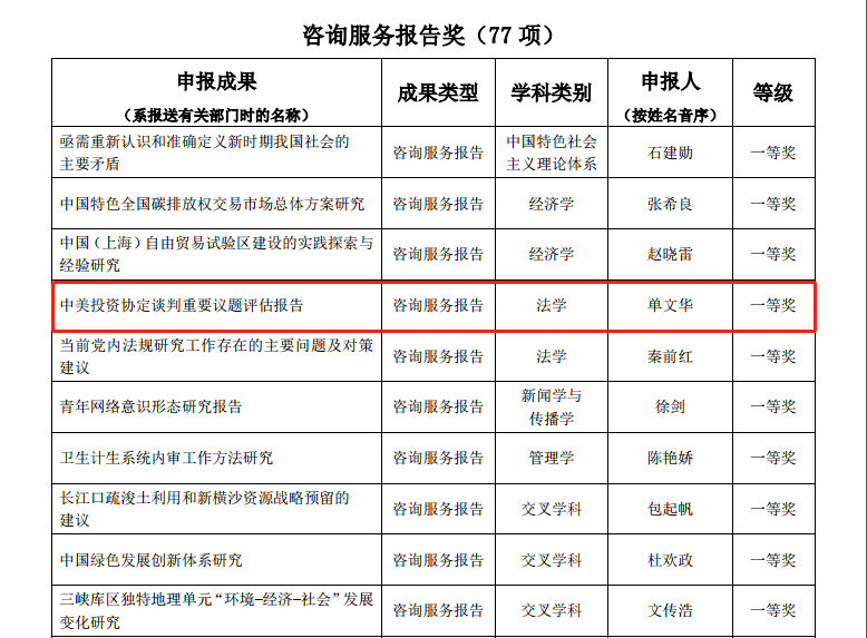 其中,bat365在线唯一官网登录院长单文华教授主持撰写的《中美投资协定谈判重要议题评估报告》荣获咨询服务报告类一等奖——这是该类型全国仅有的两项法学类一等奖获奖成果之一,也是西安交大在该奖项一等奖上的首次突破。同时,由单文华院长和王朝恩副教授等合作撰写的《关于建立国家级“一带一路法律服务与法治创新示范区”的建议》荣获咨询服务报告类二等奖,是全国5项法学类二等奖成果之一。