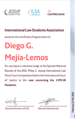 近期,bat365的外籍青年拔尖人才Diego Mejía-Lemos副教授受邀担任2021年Philip C Jessup(Jessup)国际模拟法庭大赛的法官。受疫情影响,今年的杰赛普(Jessup)以线上为主、混合形式举行,除了国家巡回赛和即将举行的全球巡回赛外,还允许组织区域巡回赛。