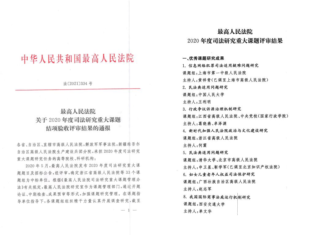 2020年5月,最高人民法院发布了2020年度司法研究重大课题题目及招标公告,经评审,确定西安交通大学单文华教授课题组等33个课题组为中标单位。这也是我校获批的第一个最高人民法院重大课题。