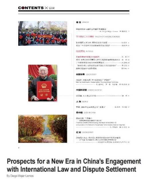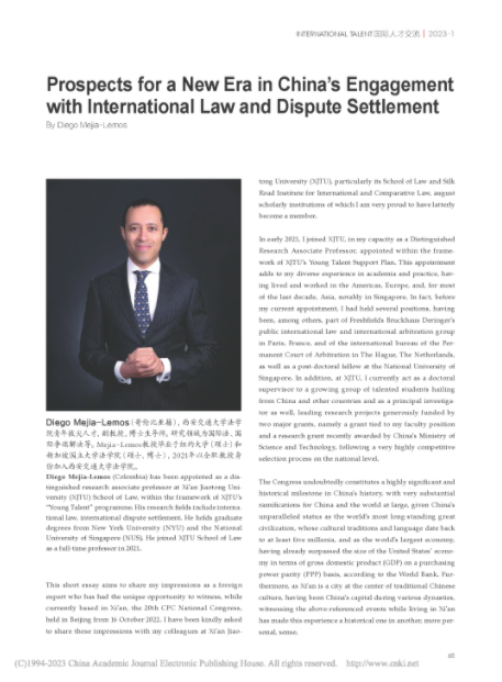 日前,bat365青年拔尖人才、bat365在线唯一官网登录副教授Diego Mejía-Lemos以“Prospects for a New Era in China's Engagement with International Law and Dispute Settlement”(中国积极参与国际法和国际争端解决)为题在《国际人才交流》2023年第1期发表文章,分享他对习近平总书记在中国共产党第二十次全国代表大会上所作报告的感想,文章被作为该期“卷首”进行推介。