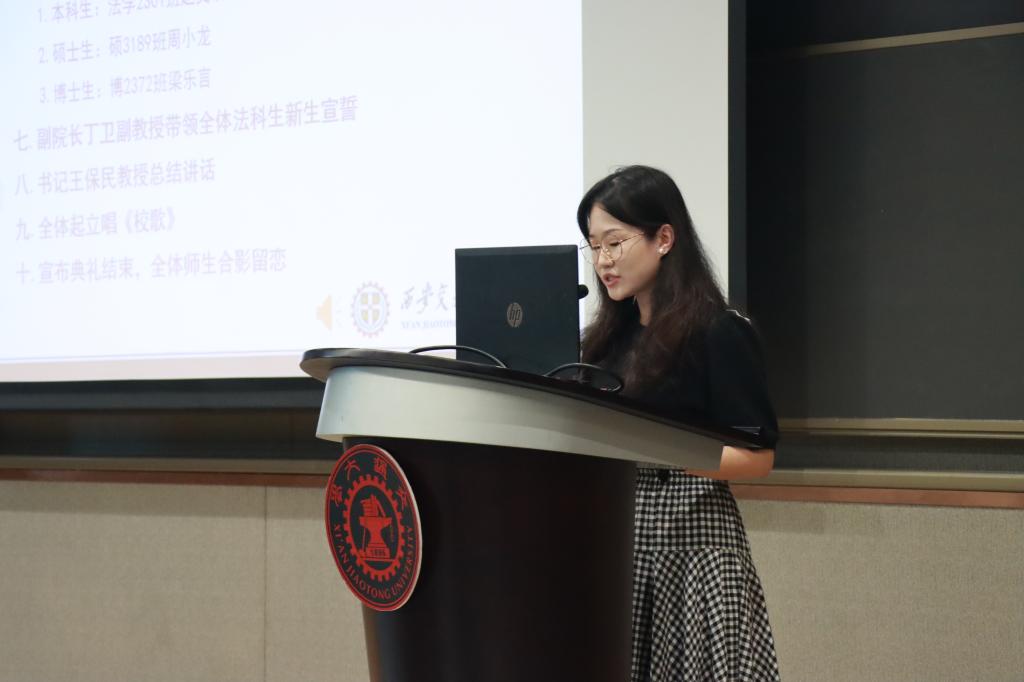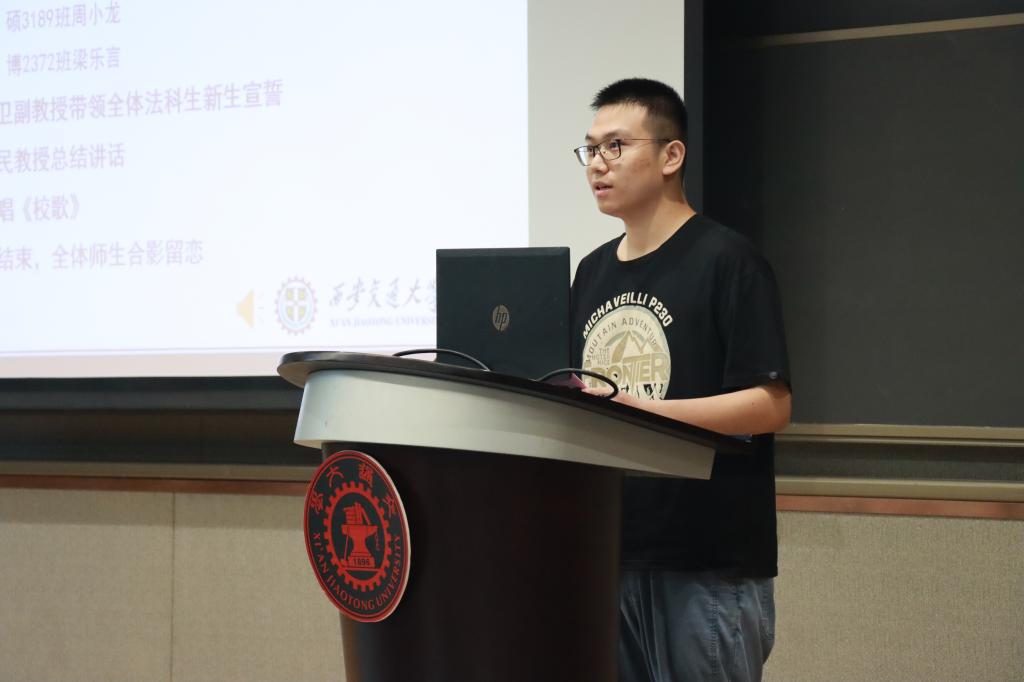 在学生代表发言环节,本科生新生代表赵文琪表达了进入交大bat365在线唯一官网登录的激动之情,言语之间流露着初学者的法治信仰和家国情怀。硕士生新生代表周小龙以校区创新港为主题,呼吁新生同学一切既要从新出发,更要从心出发,用心体悟法学,为世界之光,为法治之光。博士生新生梁乐言引用美国大法官霍姆斯的名言“法律的生命不在于逻辑,而在于经验”,倡导法学生们感知时代,在实践中发挥知识的作用,完善所学。