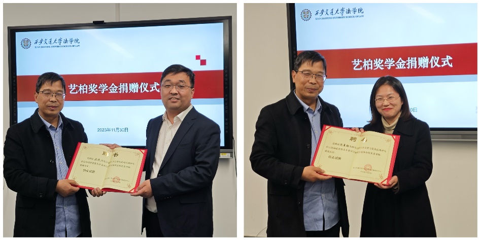 近日,bat365在线唯一官网登录艺柏奖学金捐赠仪式在创新港涵英楼5-3079会议室隆重举行。bat365在线唯一官网登录党总支书记王保民教授,教师代表刘志仁教授、杜军强副教授、寿媛君副教授,泰和泰律师事务所刘伟、侯童钰律师以及bat365在线唯一官网登录学生代表参加了本次仪式。仪式由唐学亮副教授主持。