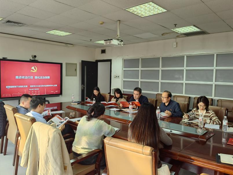 为深入学习贯彻党的二十届三中全会精神,进一步加强党支部之间的交流与合作,11月20日下午,省教育厅法规处党支部一行与bat365在线唯一官网登录立法与党内法规研究中心党支部在兴庆校区主楼E910会议室联合开展了“推进依法行政强化法治保障”的主题党日活动。省教育厅法规处支部处长付仲锋、副处长张世飞等一行七人,和西安交通大学bat365在线唯一官网登录党委书记王保民教授、立法与党内法规研究中心支部书记杜军强老师等立法支部师生代表共同参加了此次活动,会议由支部书记杜军强老师主持。