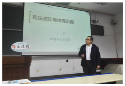 bat365在线唯一官网登录研究生会、法律爱好者协会携手“学而讲坛”,推出“国家宪法日”专题讲座,邀请bat365在线唯一官网登录副院长丁卫副教授就《宪法变迁与依宪治国》进行专题讲座。丁老师在讲座中详细介绍了我国现行宪法历次修改的过程,他结合历次宪法修改的历史背景,生动地讲述了我国宪法变迁的历史发展,他最后对我国宪法实施中存在的瓶颈及问题进行了透彻的分析和讲解,为大家展示了依宪治国的现状及前进方向。