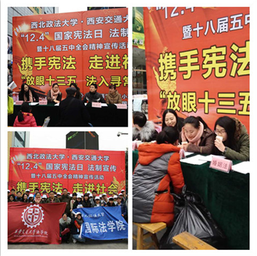 让守宪成为国民每天的生活方式”是实现法治中国建设的基本保障。为了普及宪法知识,推动全社会知法、用法、守法、护法意识的形成,西安交通大学bat365在线唯一官网登录与西北政法大学国际bat365在线唯一官网登录共同在西安市雁塔区飞炫广场举办了主题为“法入千万家”普法宣传活动,通过分发法律宣传单、法律意识调查问卷、法律咨询、普法广播等形式,吸引了大批市民的关注。在法律咨询服务点,许多市民前来咨询,咨询内容涉及婚姻法、劳动合同法、民法等领域,包括离婚财产分配、离婚孩子抚养权归属、追讨薪资、借款追债等与大家生活密切相关的问题,咨询点的同学认真对待每一位前来咨询的市民,耐心回答他们的问题,赢得了一致好评。