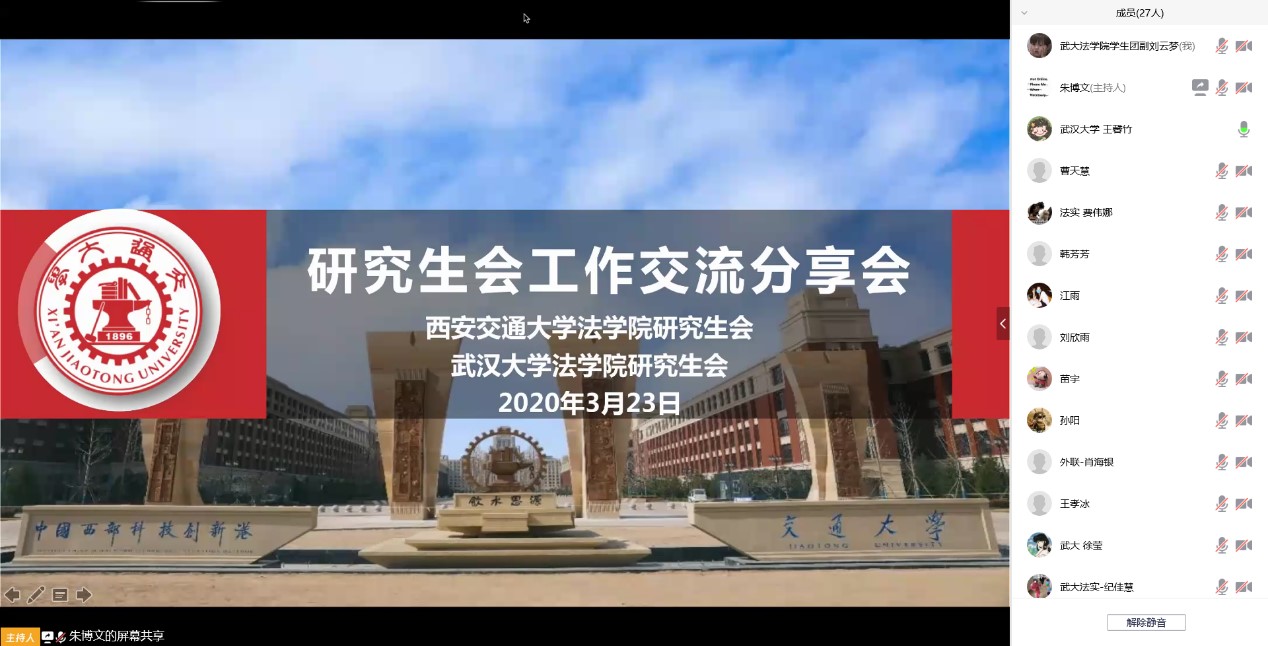 会议伊始,两院研究生会就组织建设、日常工作、精品活动、战疫工作等方面进行了交流。朱博文结合演示文档,图文并茂地向武大同学们介绍了西安交大bat365在线唯一官网登录研究生会的基本情况,研会作为学院党总支领导、团工委指导的综合性学生组织,是学院联系广大同学的桥梁和纽带,从文体、宣传、学术、心理等多个方面为同学们提供全面服务。根据团中央有关文件精神,学院去年对研会组织进行了精简,目前设主席、副主席各一人,分设组织部、宣传部与文体部三个部门,由研会主席、副主席以及部长共同管理,全体干事民主参与。研会先后举办了新港杯辩论赛、法律知识竞赛、冬至饺子宴、迎新冷餐会、元旦嘉年华以及疫情期间的“春之声”法律文化节等精品活动,受到同学们的广泛参与和高度评价,在校内外显著提升了学院的影响力。研会通过对外加强与兄弟院系研会的沟通协调,联合举办大型活动;对内与学院各党支部密切合作,由支部吸收动员入党积极分子参与活动,有效克服了交大bat365在线唯一官网登录学生规模较小,研会部门精简、人力有限对开展活动的制约。