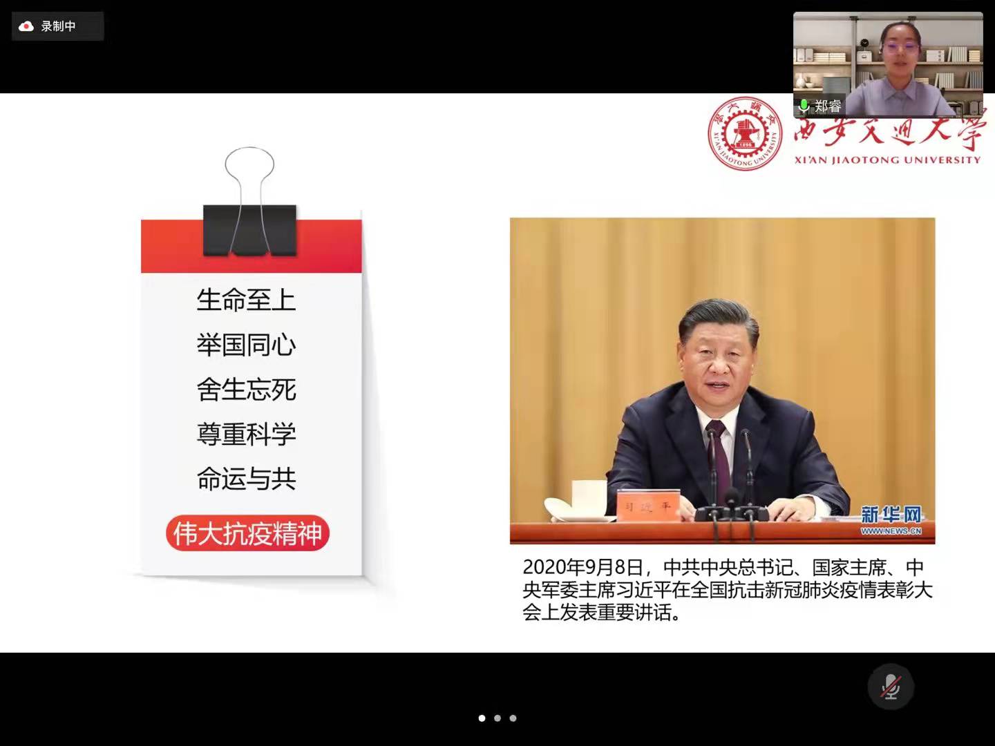 接着,王若楠、张文倩带领大家学习《通知》文件精神。张文倩首先向同学们播放了西安2021抗疫视频,向大家展示出疫情期间西安各行各业齐心协力、共同抗疫的情形,以及西安交通大学广大师生在疫情期间的携手努力。视频中熟悉的陕西方言、这座城市我们所走过的每一条街道,都让大家倍感亲切也分外暖心。