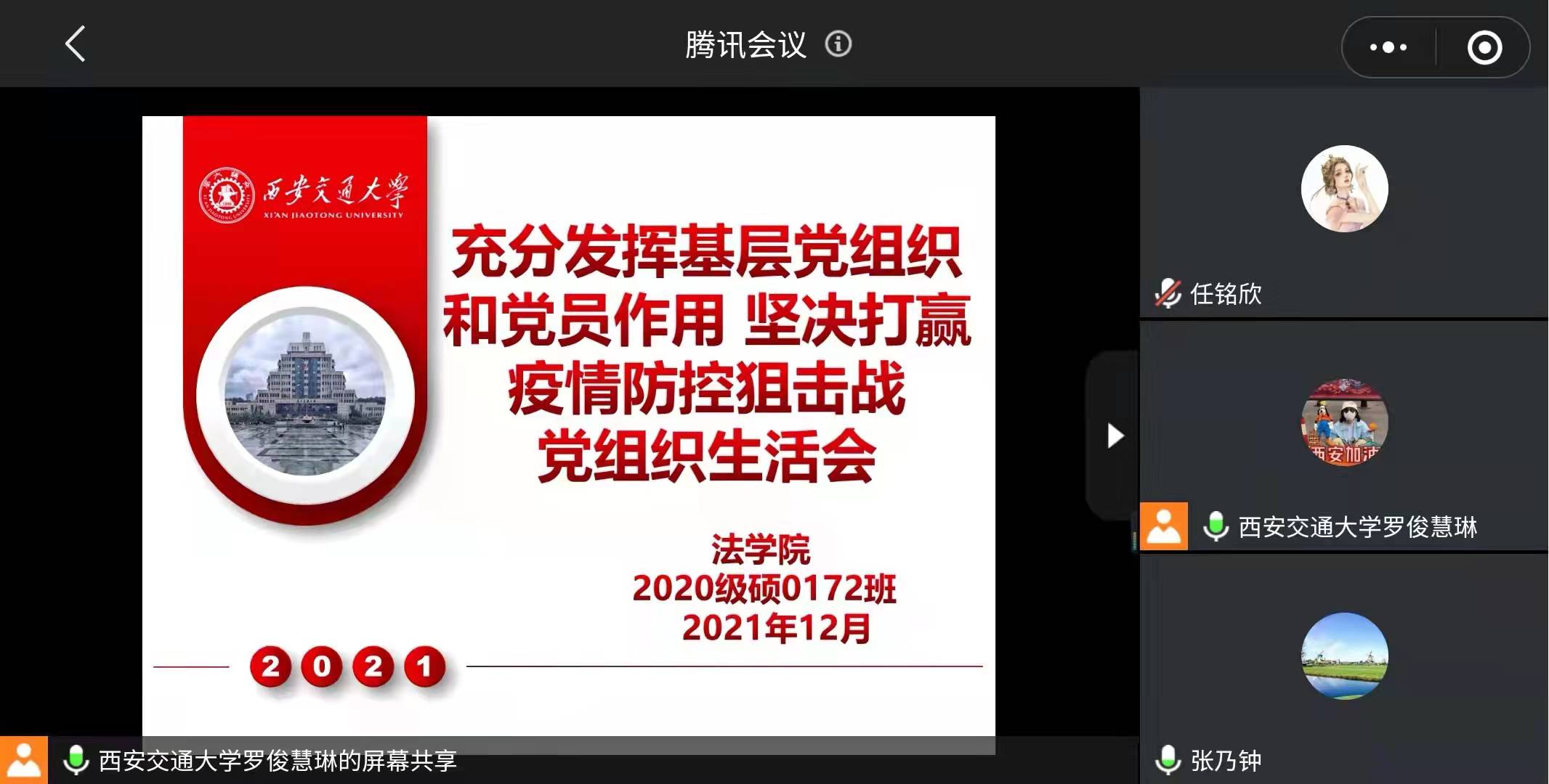 2021年12月30日晚,bat365在线唯一官网登录硕0172党支部在线上召开了以“充分发挥基层党组织和党员作用 坚决打赢疫情防控狙击战”为主题的党组织生活会。会议由硕0172党支部书记罗俊慧琳主持,bat365在线唯一官网登录党总支委员张乃钟老师出席,支部全体党员以线上方式参加了本次会议。