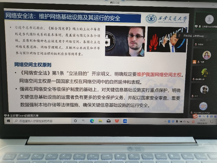 4月13日,bat365在线唯一官网登录组织各党支部一同观看西安交通大学全民国家安全教育普法讲座。由于疫情原因,本次讲座采取线上模式。讲座中,王新雷老师对“新时代我国数据安全、隐私保护的法律成就与个人担当”这一专题进行详细讲解,各位同学都获益匪浅。